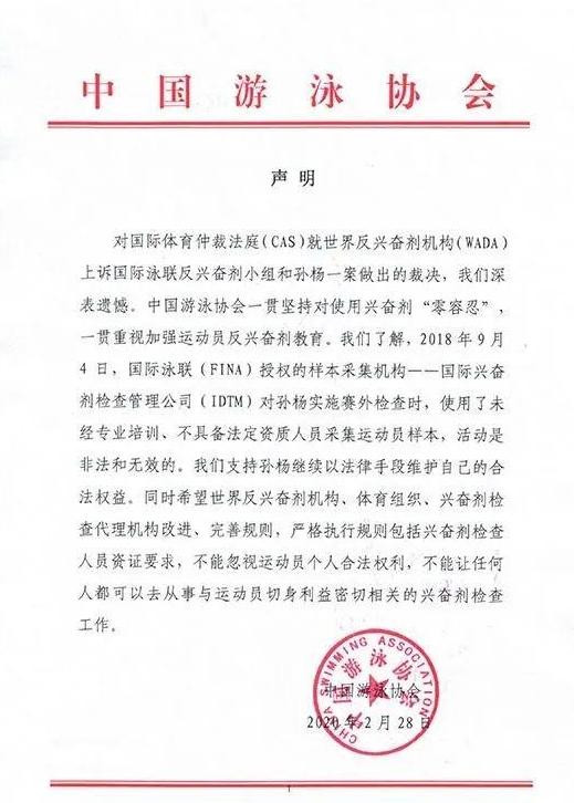 對此,中國游泳協(xié)會(huì )發(fā)表聲明,對國際體育仲裁法庭就世界反興奮劑機構上訴國際泳聯(lián)反興奮劑小組和孫楊一案做出的裁決,深表遺憾。并支持孫楊維護自己的合法權益。